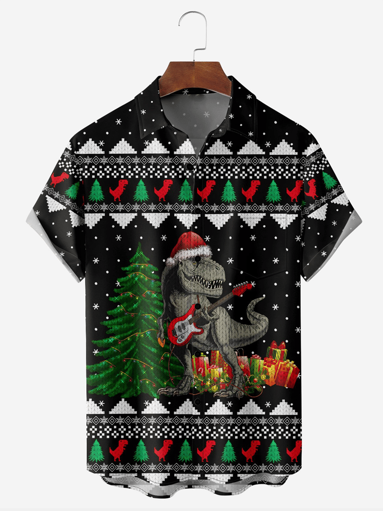 Christmas Christmas Dinosaur Ugly Chest Pocket Short Sleeve Hawaiian Shirt