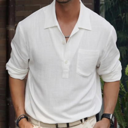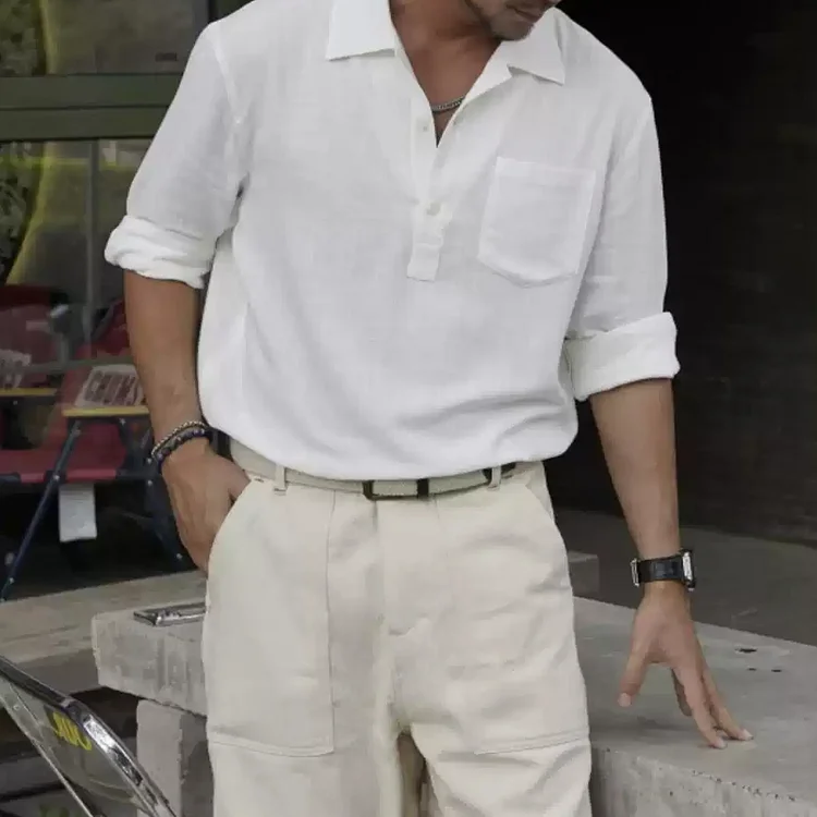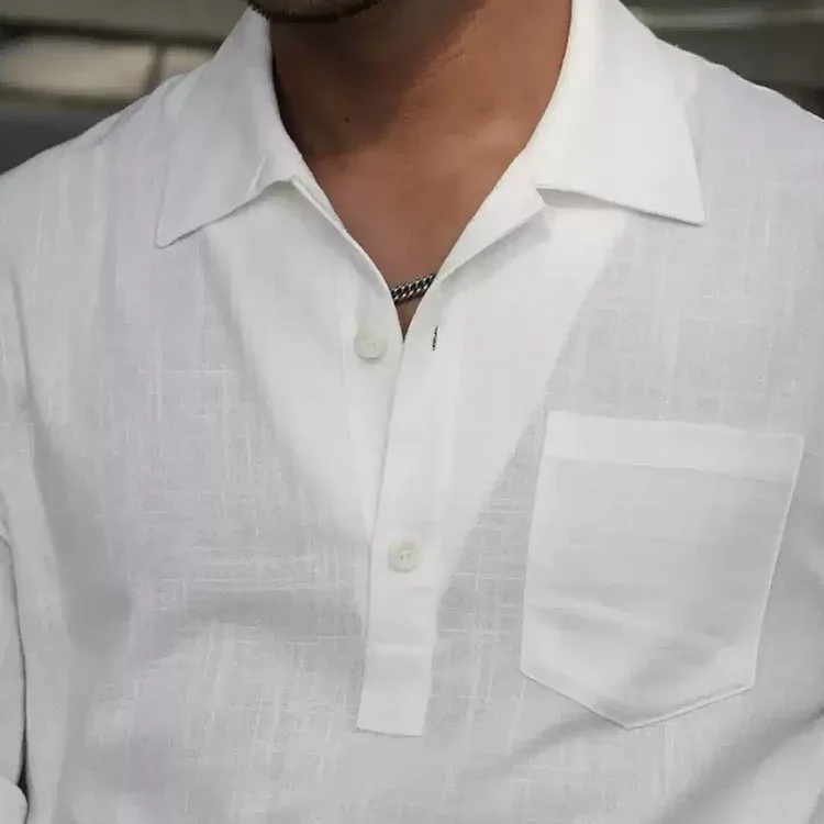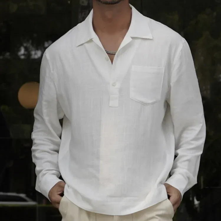 Men's Vintage White Cotton and Linen Cuban Collar Long Sleeve Shirt