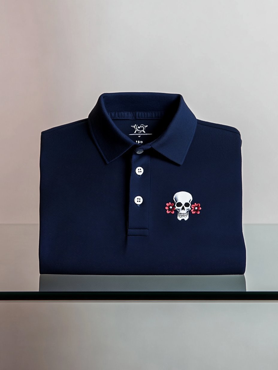 Men's Business Casual Skull and Floral Embroidered Button-Down Short-Sleeved Polo Shirt