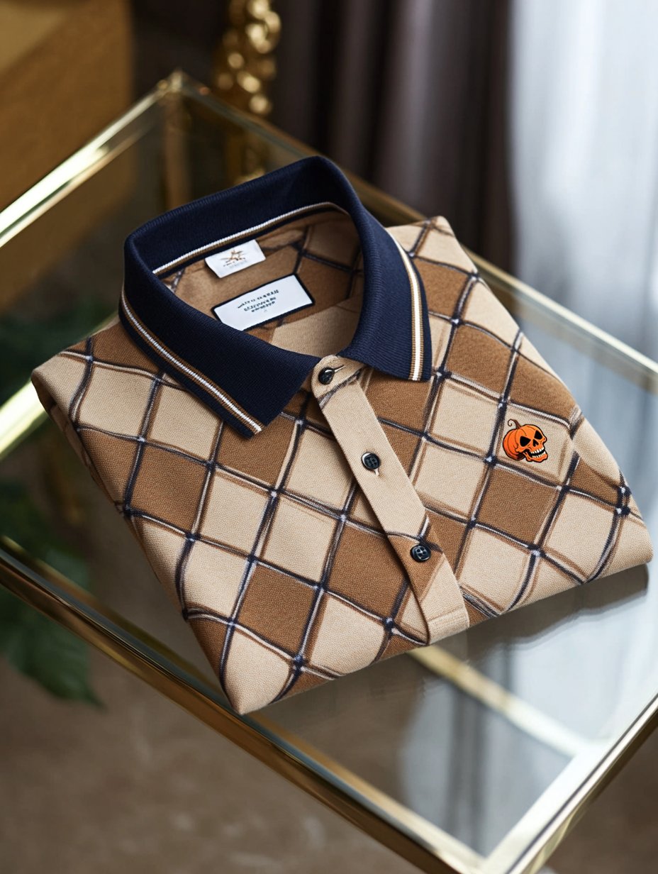 Men's Classic Business Check Halloween Pumpkin Skull Logo Button Short Sleeve Polo Shirt